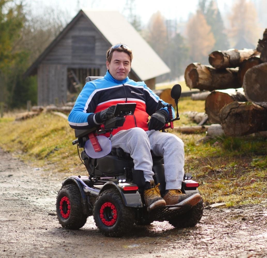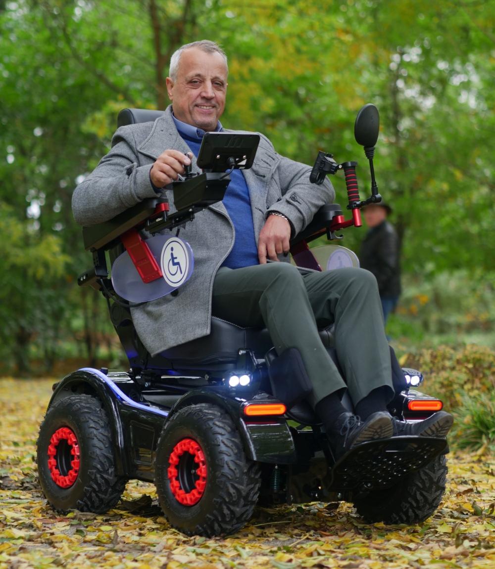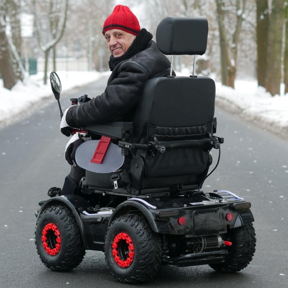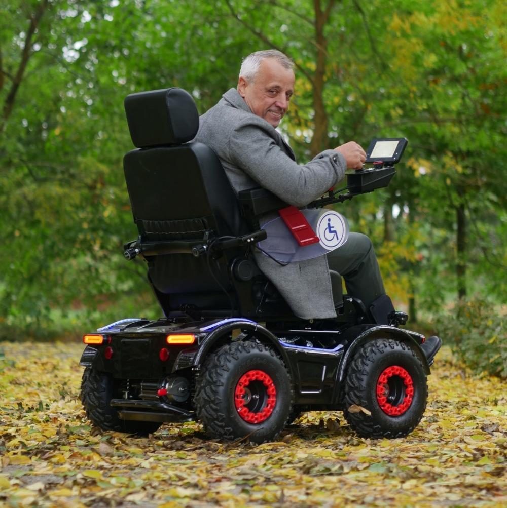 Elektryczne sterowanie przednim kołem joystickiem zapewnia precyzję i płynność jazdy nawet na nierównościach.Zawieszenie z podwójnymi amortyzatorami oraz regulowane siedzisko sprawiają, że wózek jest wygodny zarówno w mieście, jak i w terenie.